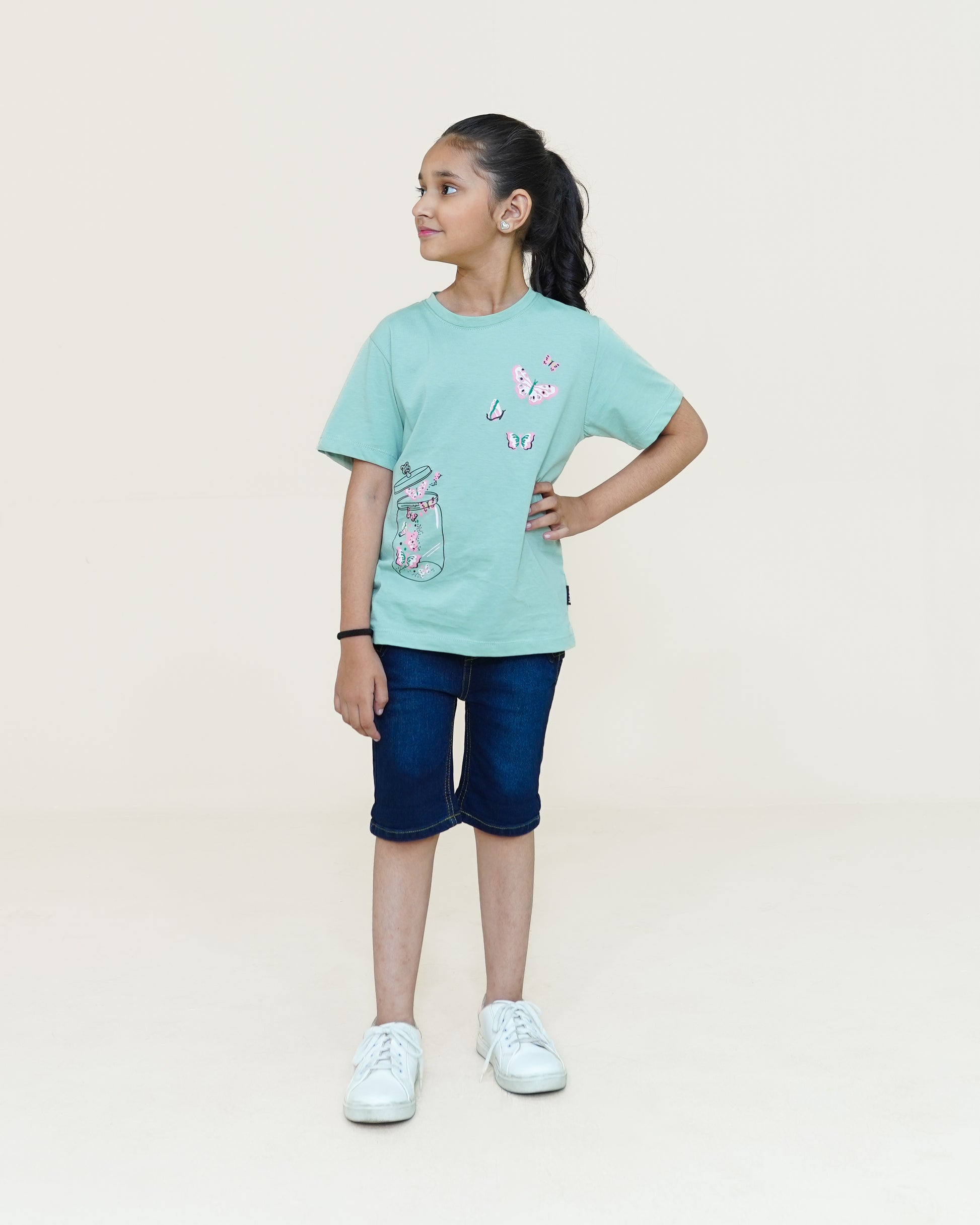 Delight her wardrobe with this charming Butterfly Jar T-shirt in mint green! Made from soft, breathable fabric, it's perfect for everyday wear, adding a touch of magic and comfort to her day.