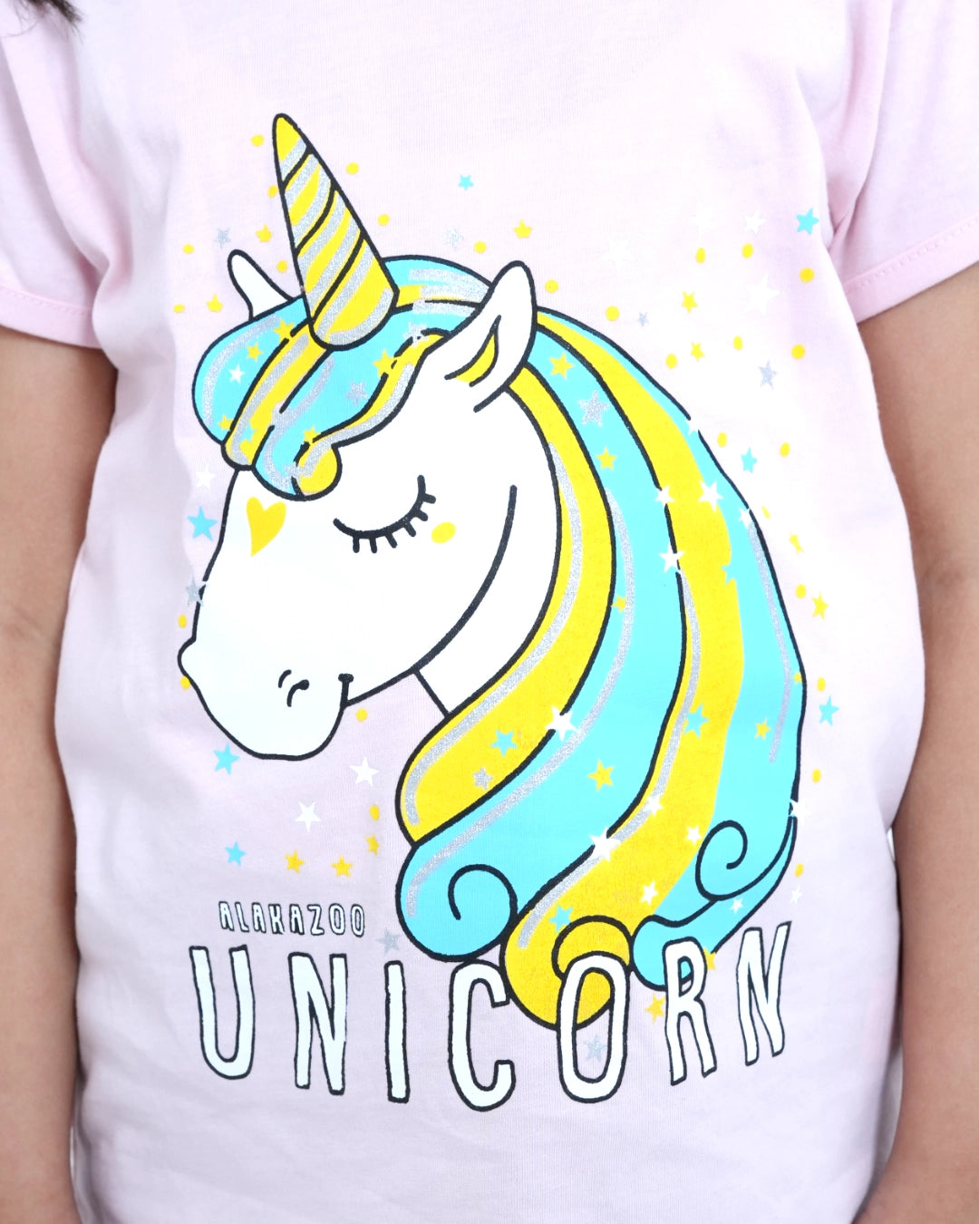 Girls will sparkle in this light pink unicorn T-shirt, perfect for summer magic. Soft and vibrant, it’s a whimsical addition to any kid’s wardrobe!