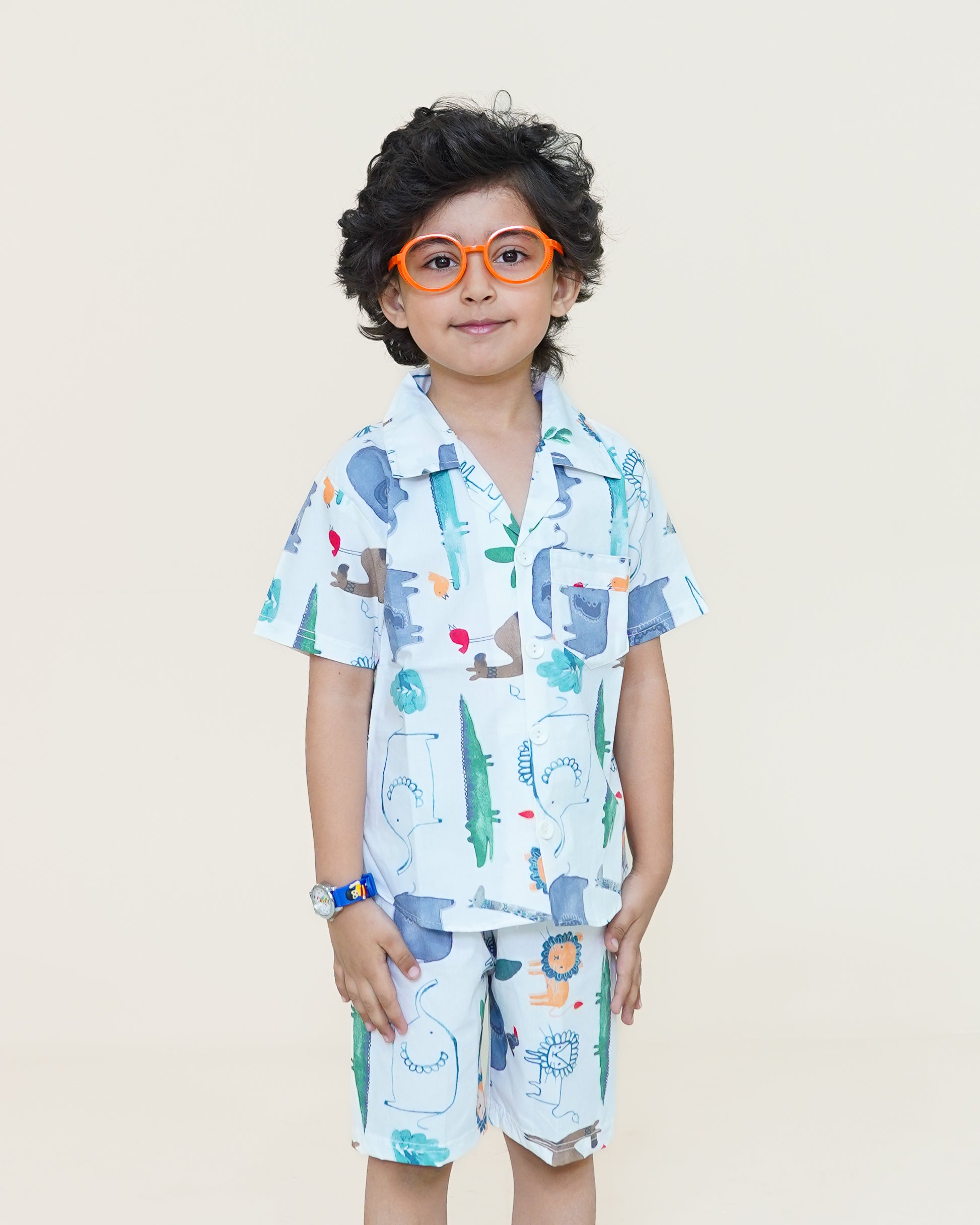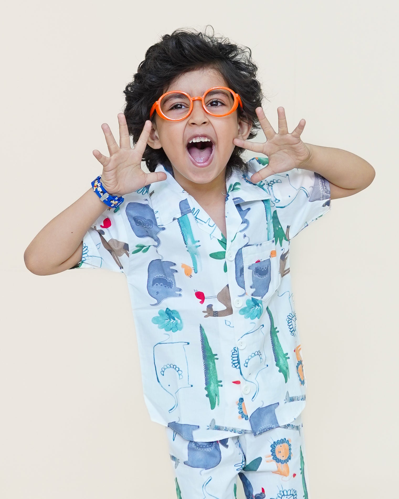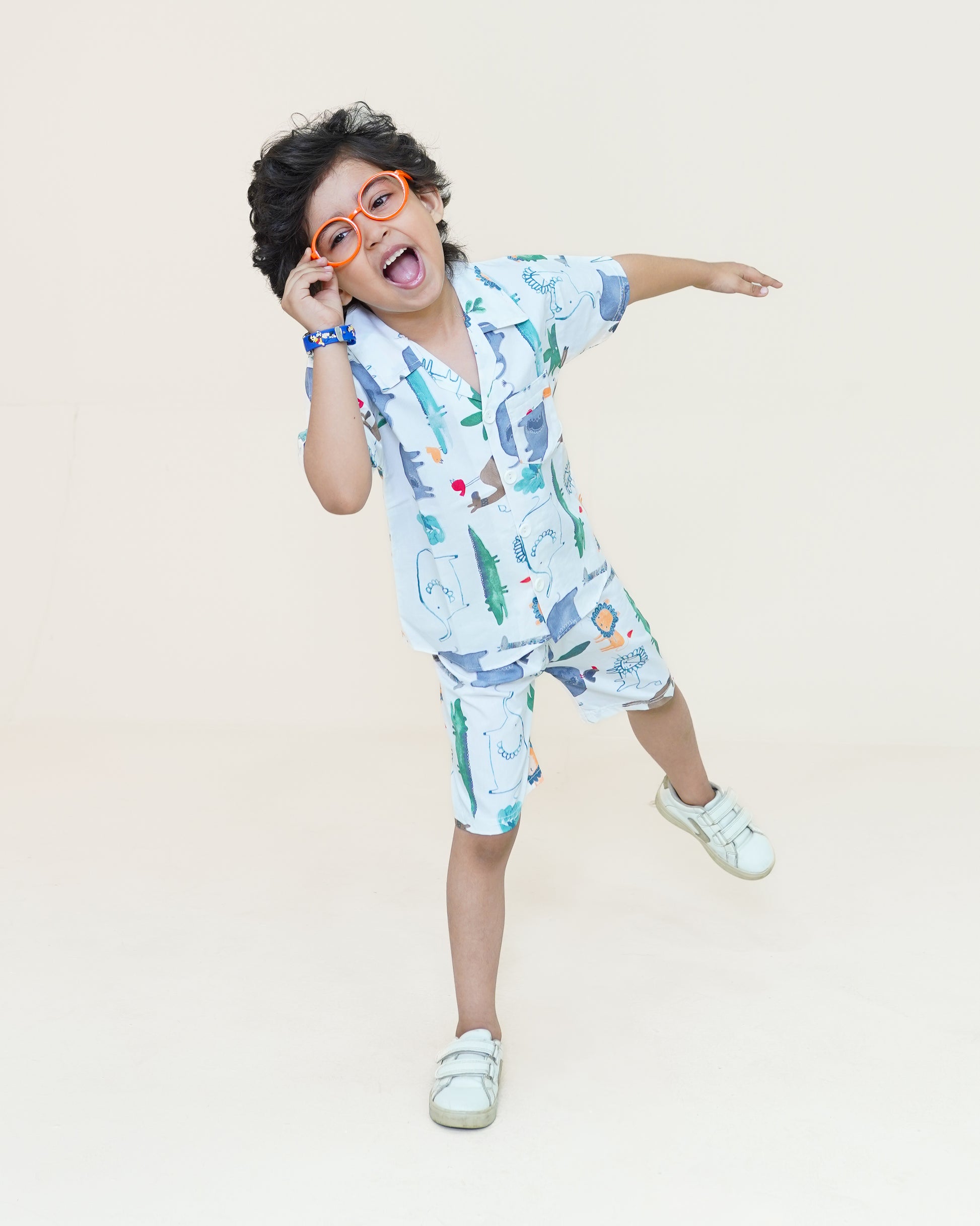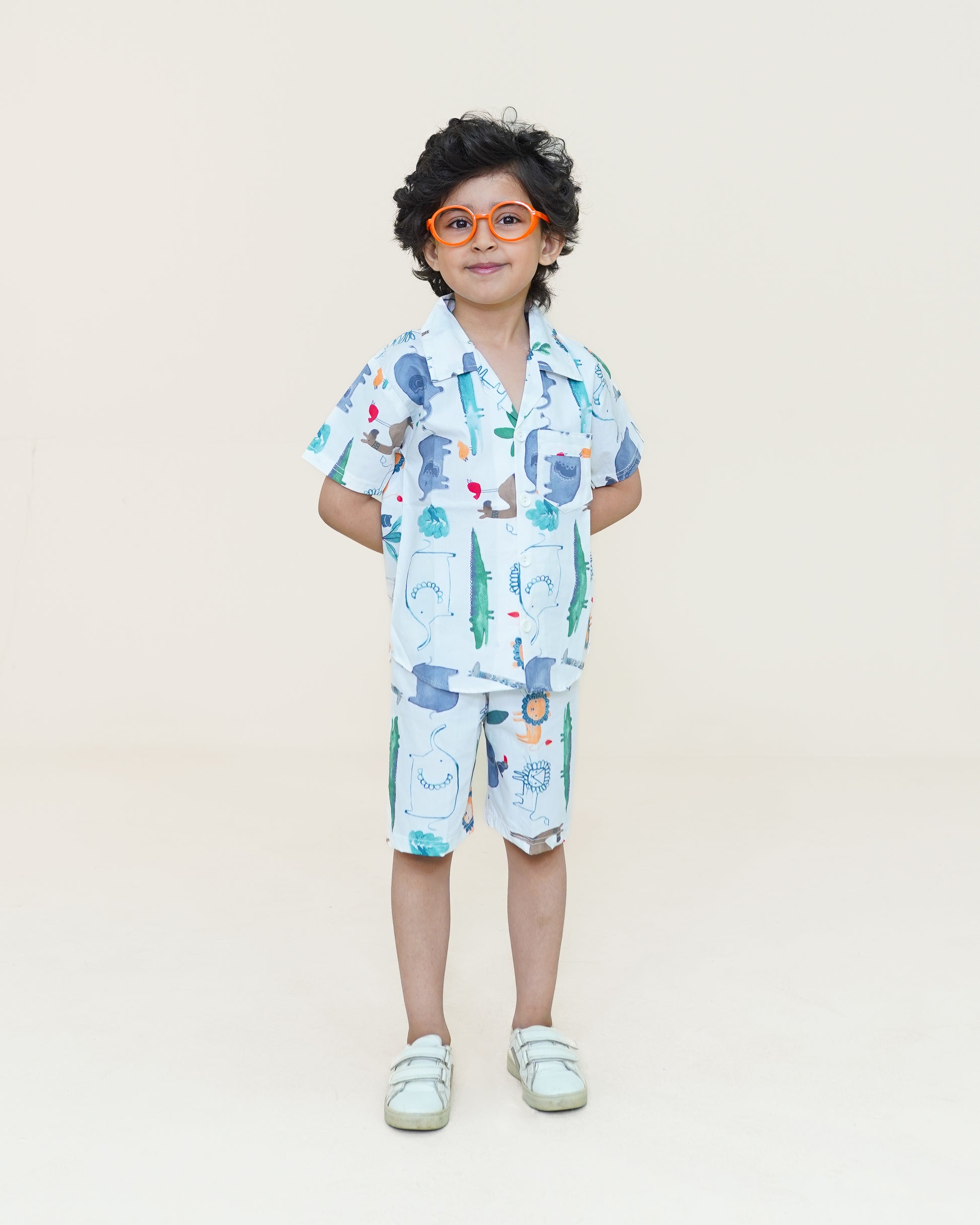 Style him up with the Safari Animals Print Co-ord Set! Soft, comfy, and adorable, it's perfect for playdates, picnics, and sunny day adventures.