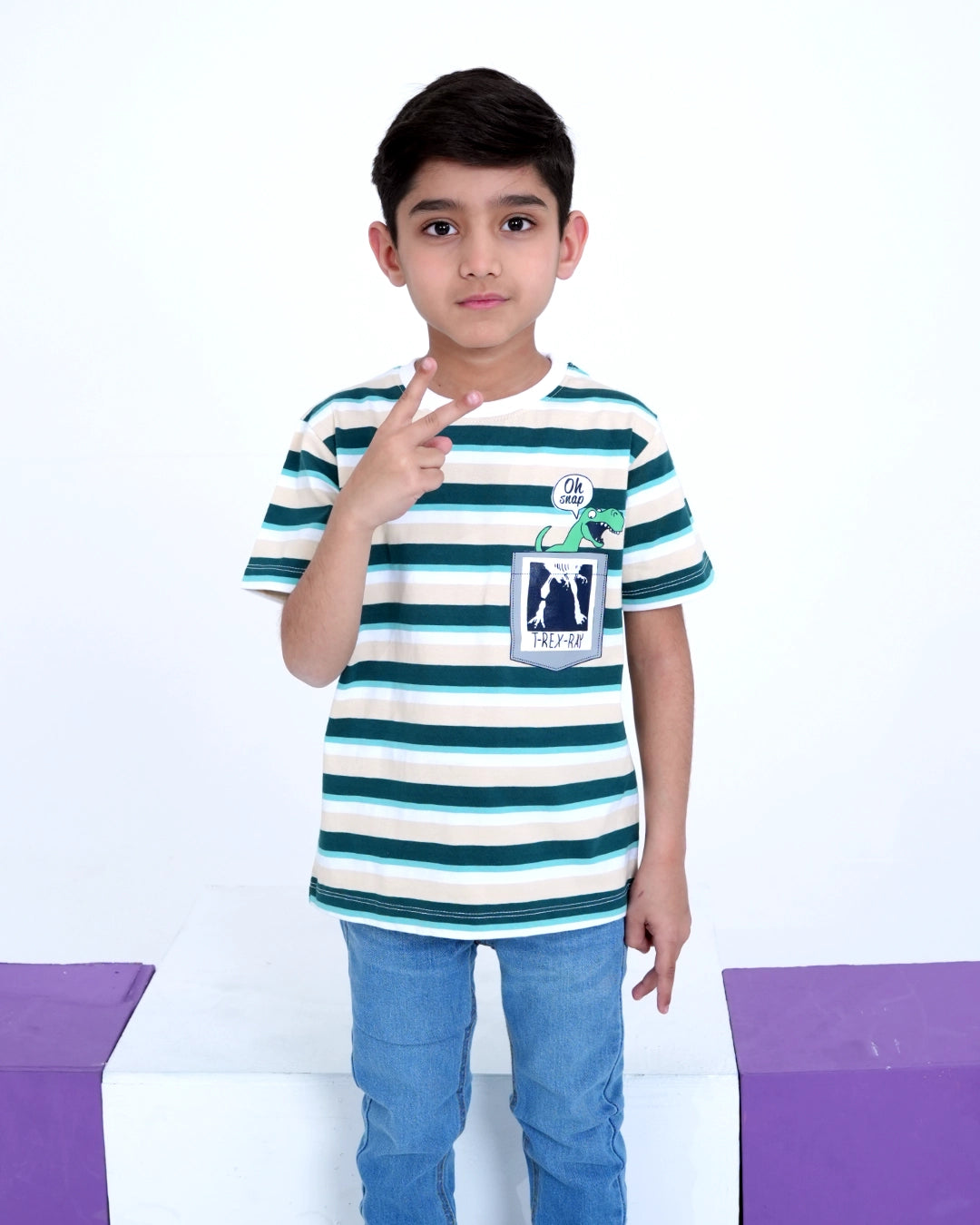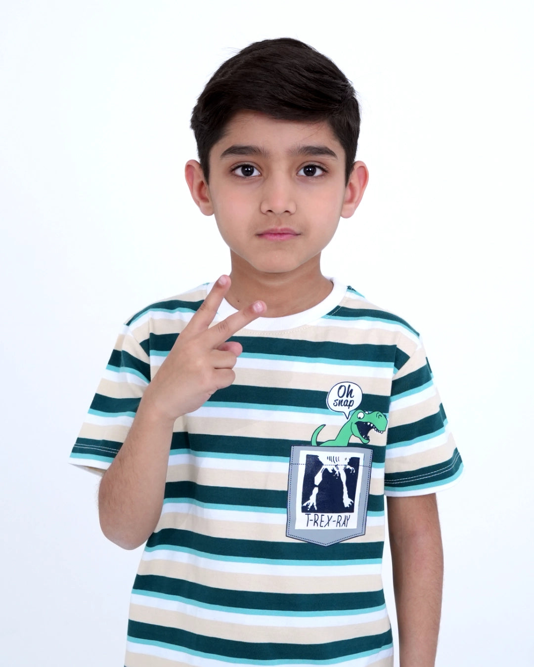 Dino fans, rejoice! This T-Rex grey striped T-shirt is designed for boys who love prehistoric style. Crafted with comfortable fabric, it’s an ideal summer pick for your little explorer!